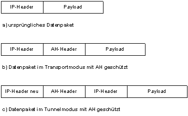 Tunnelmodus. Im Transportmodus wird der AH zwischen IP-Header und Payload, z.B. dem TCP-Paket, eingefügt. Der Tunnelmodus wird benutzt, wenn zwei Standorte mit mehreren Rechnern über Security