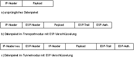 Originalheader des IP-Pakets beibehalten, im Tunnelmodus wird der ursprüngliche IP-Header zusammen mit dem Payload verschlüsselt und es wird ein neuer IP-Header vor das gesamte Paket gesetzt.