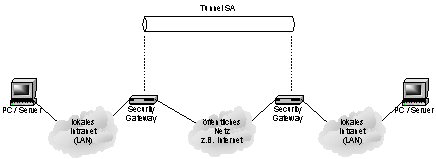 Im Falle der LAN zu LAN Verbindung müssen nur die Security Gateways für IPSec konfiguriert werden. Die Endgeräte erhalten ihre