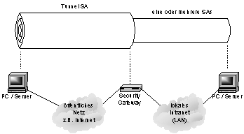 und somit dem Security Gateway LAN-seitig alle Arbeit zu überlassen. Ebenfalls denkbar wäre eine SA zwischen den Endgeräten ohne den Tunnelmodus zum Security Gateway. Dieser Fall entspräche allerdings der Ende zu
