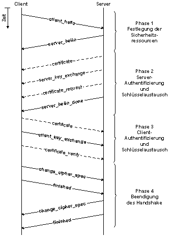 sever_key_exchange (12): Diese Meldung wird nicht geschickt, wenn der Server ein Zertifikat mit festen Diffie-Hellman Parametern oder mit RSA-Schlüsselaustausch besitzt. Im Falle von anonymem Diffie-Hellman, ephemeral Diffie-Hellman, KEA oder, wenn RSA nur zur Signierung benutzt wird, wird die Meldung server_key_exchange gesendet. Die Meldung enthält die einzelnen Parameter, die das jeweilige Schlüsselaustauschverfahren benötigt, und wird vom Server signiert. Zur Signierung dienen die Zufallswerte von Client und Server und die Parameter des Schlüsselaustauschs als Input für den DSS oder die Hashfunktion. Im letzteren Fall wird der Hashwert mit dem öffentlichen Schlüssel des Servers verschlüsselt.