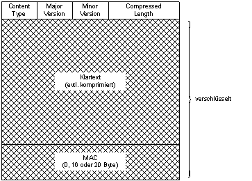 Typ des nächsthöheren Protokolls, die Länge des komprimierten oder nichtkomprimierten Datenblocks und der Datenblock selber. Der geheime Schlüssel, der zur Erstellung des MAC nötig ist, wurde durch das Handshake